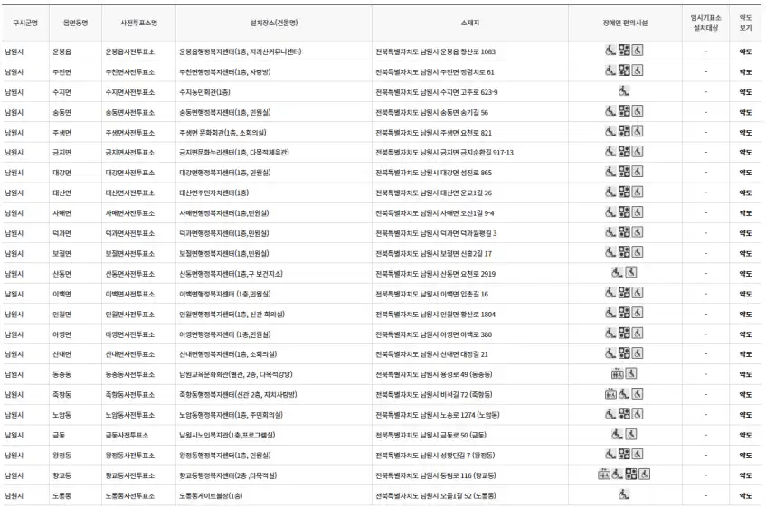 남원시 내 사전투표소는 행정복지센터에 설치되어 있습니다. 예를 들어, 운봉읍행정복지센터(1층, 지리산커뮤니센터), 주천면행정복지센터(1층, 사랑방), 수지농민회관(1층) 등이 있습니다. 자세한 위치는 중앙선거관리위원회 홈페이지에서 확인하실 수 있습니다.